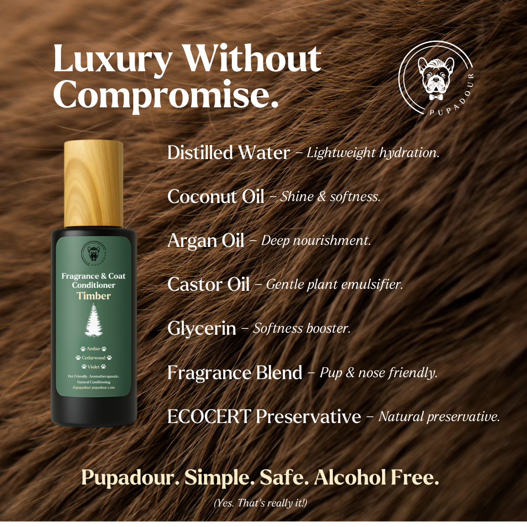 A subtle, nose-friendly fragrance made from pre-diluted essential oils. Designed to refresh without overwhelming sensitive canine senses.