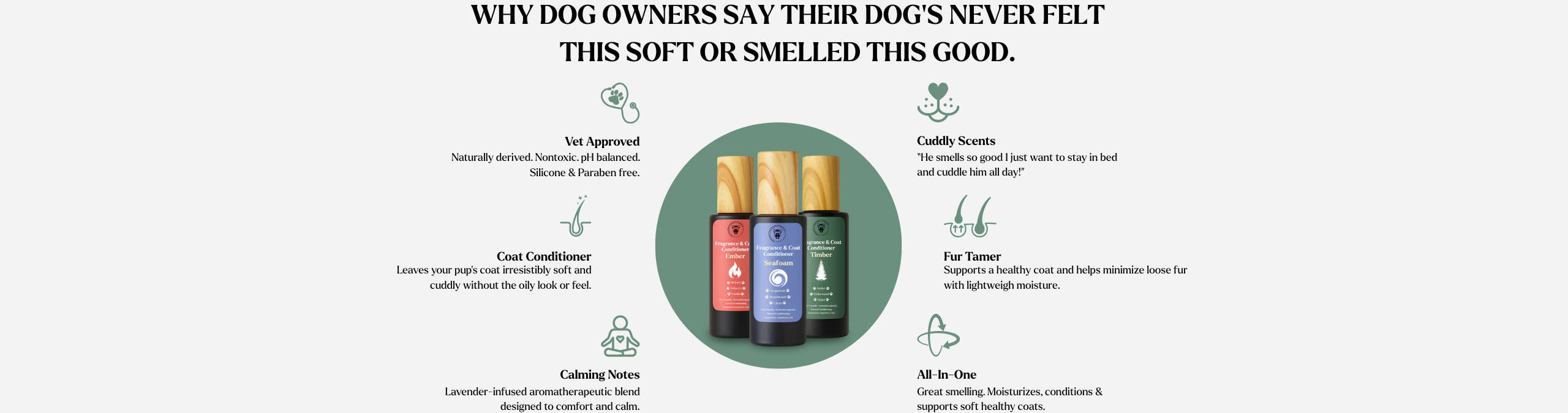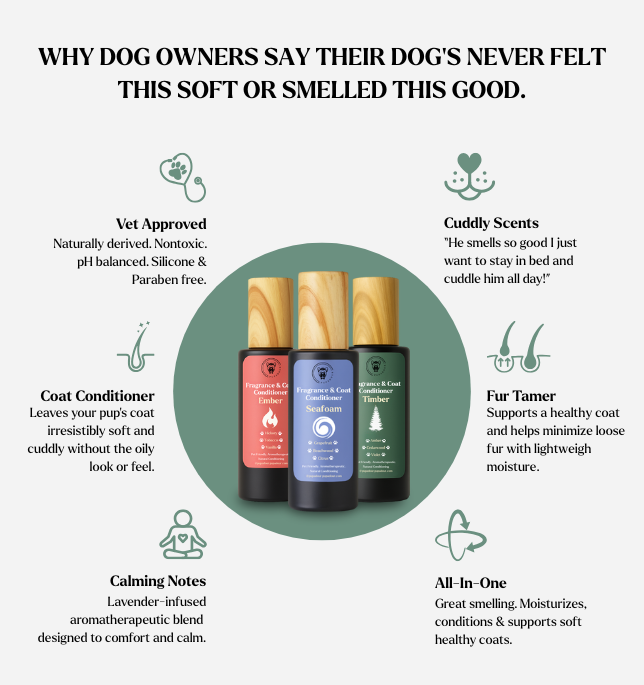 A subtle, nose-friendly fragrance made from pre-diluted essential oils. Designed to refresh without overwhelming sensitive canine senses.