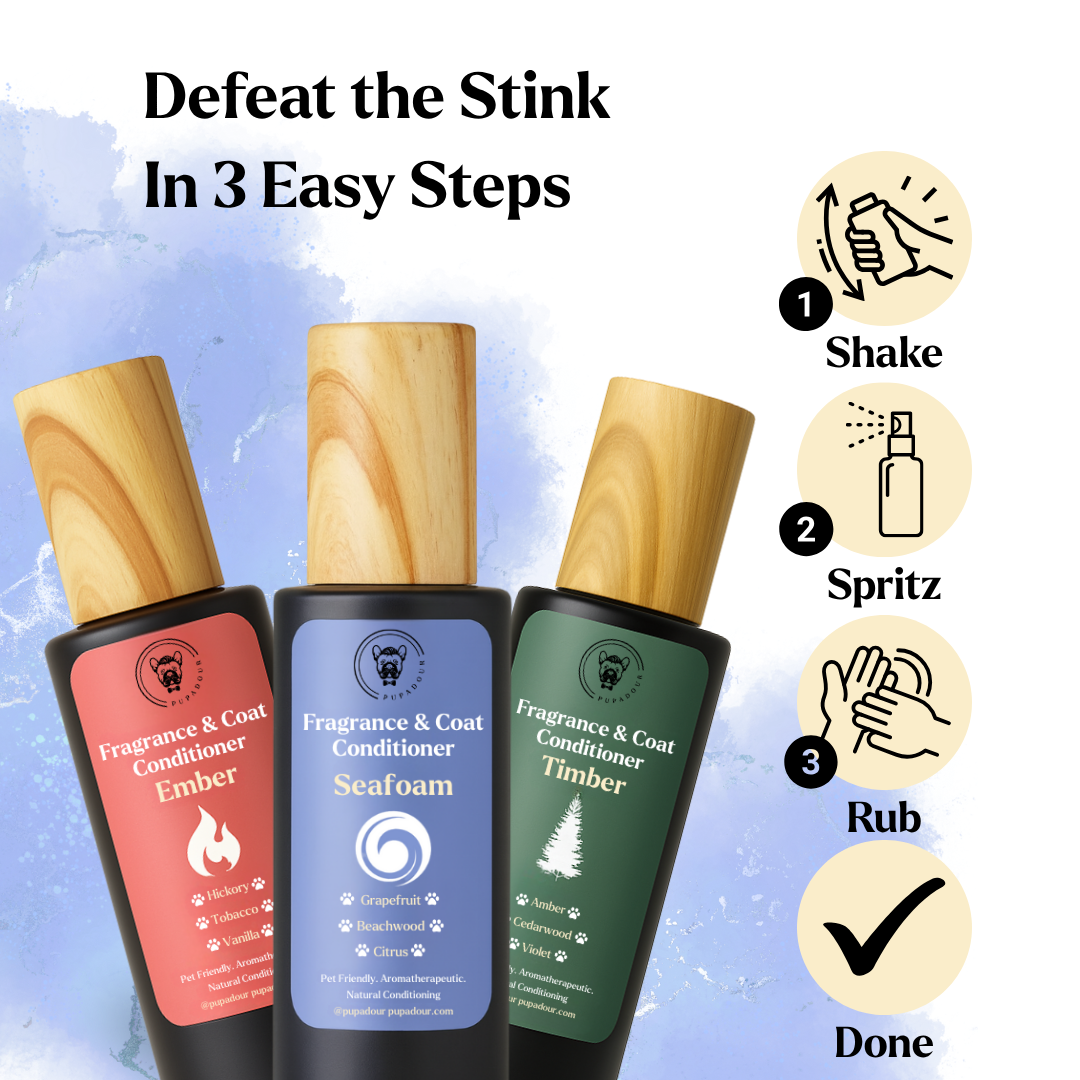 "I wasn’t sure which scent I’d like best, so I grabbed the triple pack and now I’m obsessed with all three. They each have their own vibe: Seafoam is fresh, Timber is clean and woodsy, and Ember is warm and cozy. My dog’s coat feels softer, smells amazing, and we’ve definitely stretched the time between baths."