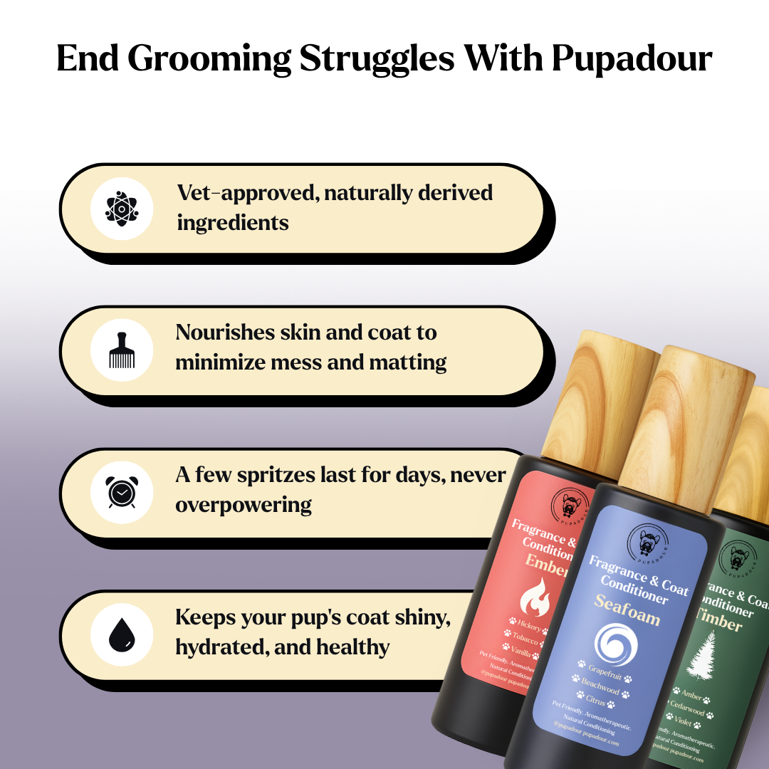 Before Pupadour, your pup's coat might feel rough, smell "lived-in", and shed more than you'd like. After a few spritzes, it's softer, fresher, and smoother making cuddles better and bath time less urgent.