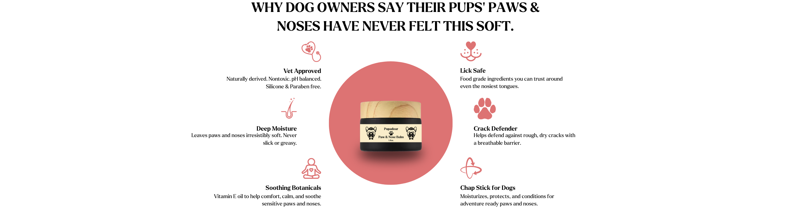 Our balm is a luxe, all-natural treatment designed to soothe, protect, and heal your pup’s delicate paws and nose. It helps with dry, cracked skin caused by weather, rough surfaces, or everyday wear, leaving your dog soft, comfy, and kissably smooth.